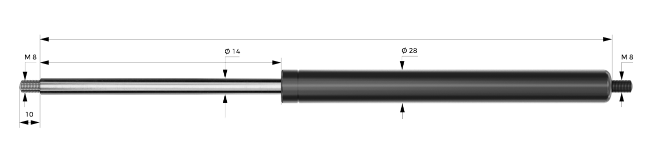 L’ampia gamma dei nostri pistoni a gas industriali a spinta con diametro dello stelo di 14 mm e corpo di 27 mm viene realizzata con filettatura M8. In combinazione con un’ampia gamma di terminali, supporti e accessori, offre una grande versatilità di utilizzo.
